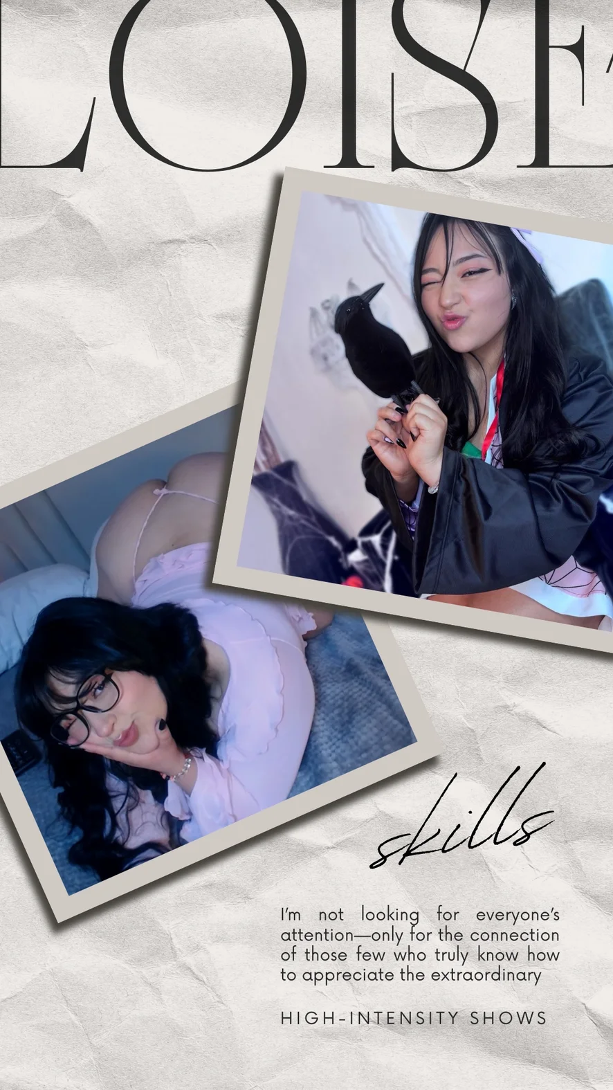 Doggy style, Spanking, Erotisk dans, Stripping, Blotting, Oljeshow, Fotfetish, Puppeknull, Kukkvurdering, Røyking, Dobbel penetrering, Cosplay, Cuckold, Analleketøy, Gagging, Ahegao, Fingring, Blowjob, Onani, Hæler, Handjob, Twerk, Brystvorteleker, Kameltå, Dildo eller vibrator, Toppløs, Rollespill, Orgasme, Sexleketøy, Hardcore, Cowgirl, Anal, Sprut, Deepthroat, Skittensnakk, Creampie